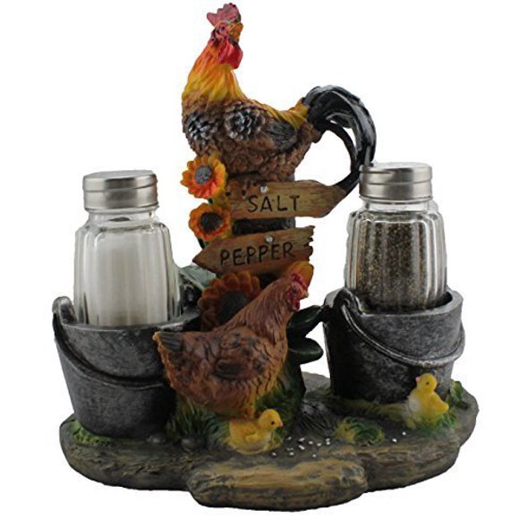 Proud Rooster Glass Salt and Pepper Shaker Set for Farm ... Features of Proud Rooster Glass Salt and Pepper Shaker Set for Farm Table Centerpiece or Country Kitchen Decor by Home 'n Gifts: Product Dimensions (L x W x H): 5.62 x 5.12 x 7.88 Inches; Weight (Pounds): 1.6; Material(s): Polyresin base sculpture and includes 2 glass salt and pepper shakers.