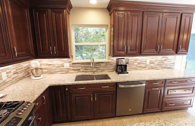 Giallo Ornamental - Granite & Kitchen Studio Giallo Ornamental granite countertop with pencil edge, under-mount sink, and full 4 X4 Crema Marfil granite tile backsplash