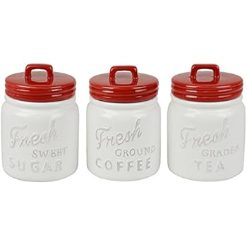 mason jar ceramic canister set for kitchen - set of 3 ... Free 2-day shipping. Buy mason jar ceramic canister set for kitchen - set of 3 decorative storage containers with air-tight lids for coffee, sugar & more - country style storage w/reusable writable surface - 12.85oz/canister at Walmart.com Amazon.com: Teal Ceramic Farmhouse Mason Jar Canister Set ... 1,324 5 offers from $22.03 American Atelier Vintage Canister Set 3-Piece Ceramic Jars Chic Design with Lids for Cookies, Candy, Coffee, Flour, Sugar, Rice, Pasta, Cereal & More, 21x8x11, White with Black Distressing 503 in Food Jars & Canisters 3 offers from $35.98 Amazon.com: Mason Jar Ceramic Canister Set for Kitchen ... Mason Jar Ceramic Canister Set for Kitchen - Set of 3 Decorative Storage Containers with Air-Tight Lids for Coffee, Sugar & More - Country Style Storage w/Reusable Writable Surface - 12.85oz/Canister . Visit the Comfify Store. 4.3 out of 5 stars 948 ratings. $29.99 $ 29. 99 Set of 3 Classic Red Ceramic Jar Canisters - Walmart.com Set of 3 ceramic jar canisters These canisters include a silicone gasket to ensure a tight fit every time A perfect set for your pantry or countertop to hold sugar, coffee, and tea Recommended for indoor use only Measures 5.6 inches high by 4 inches wide by 4 inches long Specifications Customer Comments What others said when purchasing this item