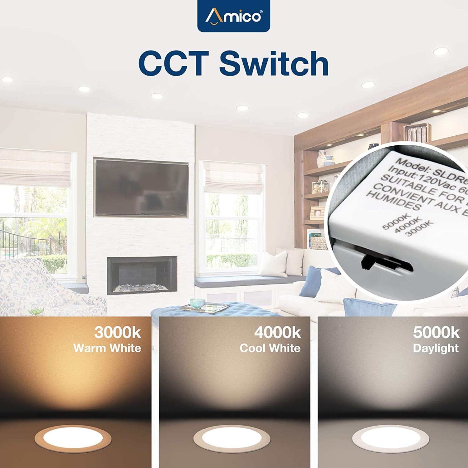 3 Inch Canless 5 Selectable Color Temperature Baffle Round LED Ultra-Slim Downlight With Junction Box, 2700/3000/3500/4000/5000K, Dimmable, 500LM, ...